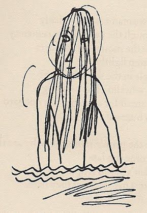 The picture that illustrates ‘Not Waving but Drowning’ seems to work slightly against the text of the poem. The girl is not waving, nor drowning, nor is she dead, nor a man, as the poem depicts. With her hair still over her face, it is as if she has been under the water and then has changed her mind and quickly bobbed up again. It is a funny image and yet look at the seriousness in her eyes. She is still somewhere else, in a world of her own (as suggested by the strange bubble around her head). Is she looking toward that other world (death) that she has been tempted by?