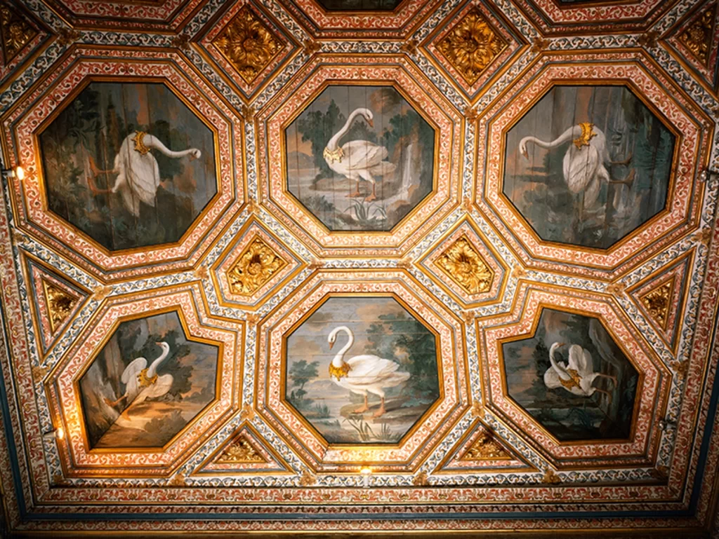 Two majestic painted ceilings : First ‘Swans Hall’ and then the more mysterious ‘Magpie Room’.